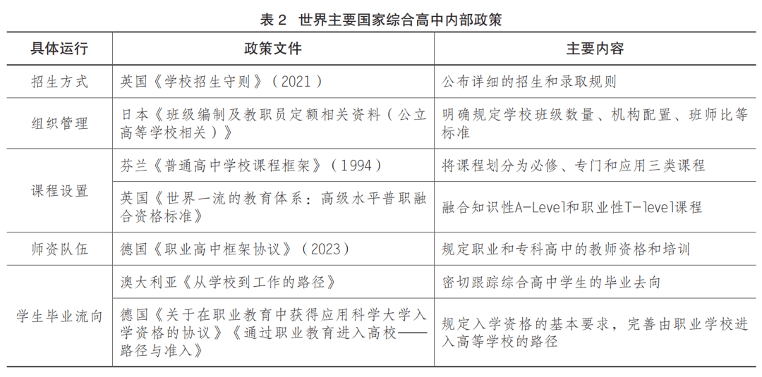 一是招生方式,2021年英国政府颁布《学校招生守则》,明确公布详细的招生和录取规则。二是组织管理,日本《班级编制及教职员定额相关资料(公立高等学校相关)》明确规定了学校班级数量、机构配置、班师比等标准。三是课程设置,英国《16岁技术教育改革—T级行动计划》《世界一流的教育体系:高级水平普职融合资格标准》改革课程体系,融合知识性A-Level和职业性T-level课程,打通学术和职业教育的分野。四是师资队伍,2023年德国最新颁布的《职业高中框架协议》明确规定了职业高中的教师资格与培训方式。五是学生毕业流向,澳大利亚国家职业教育中心密切跟踪综合高中学生的毕业去向,并发布《从学校到工作的路径》调查报告;2015年,德国颁布《通过职业教育进入高校—路径与准入》,完善了职业教育进入高等学校的路径。上述核心内容如表2所示。