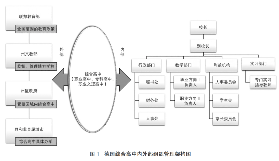 综合高中通常遵循国家或地方政府制定的管理规范,运作趋向标准化。一类是中央集中式,代表国家为日本。综合高中由国家教育部直接管理,统一制定课程标准、教师培训和考试制度,教育资源配置具有较强的调控能力。二类是地方分权式。以德国为例,各联邦州的文教部作为最高学校监管部门,负责制定教育政策、课程大纲和考试规定,并定期评估监控教学质量。各州区政府监督和管理其管辖区域内所有学校,确保各学校贯彻执行州教育部的政策。县和非县属城市具体负责综合高中办学工作,学校内部组织架构与其他学校基本一致,主要有校长、副校长,行政部门、分管具体职业方向的部门负责人以及各类利益代表机构。此外由于学生需要校外实习,因此有专门实习指导教师负责协调和管理(见图1)。