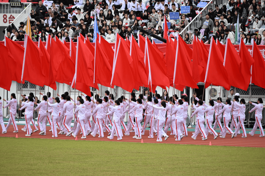 体育场内彩旗招展、掌声雷动,来自各系的学子们身着整齐服装,以饱满的热情集结赛场,共同迎接这场充满活力与拼搏精神的体育盛会。