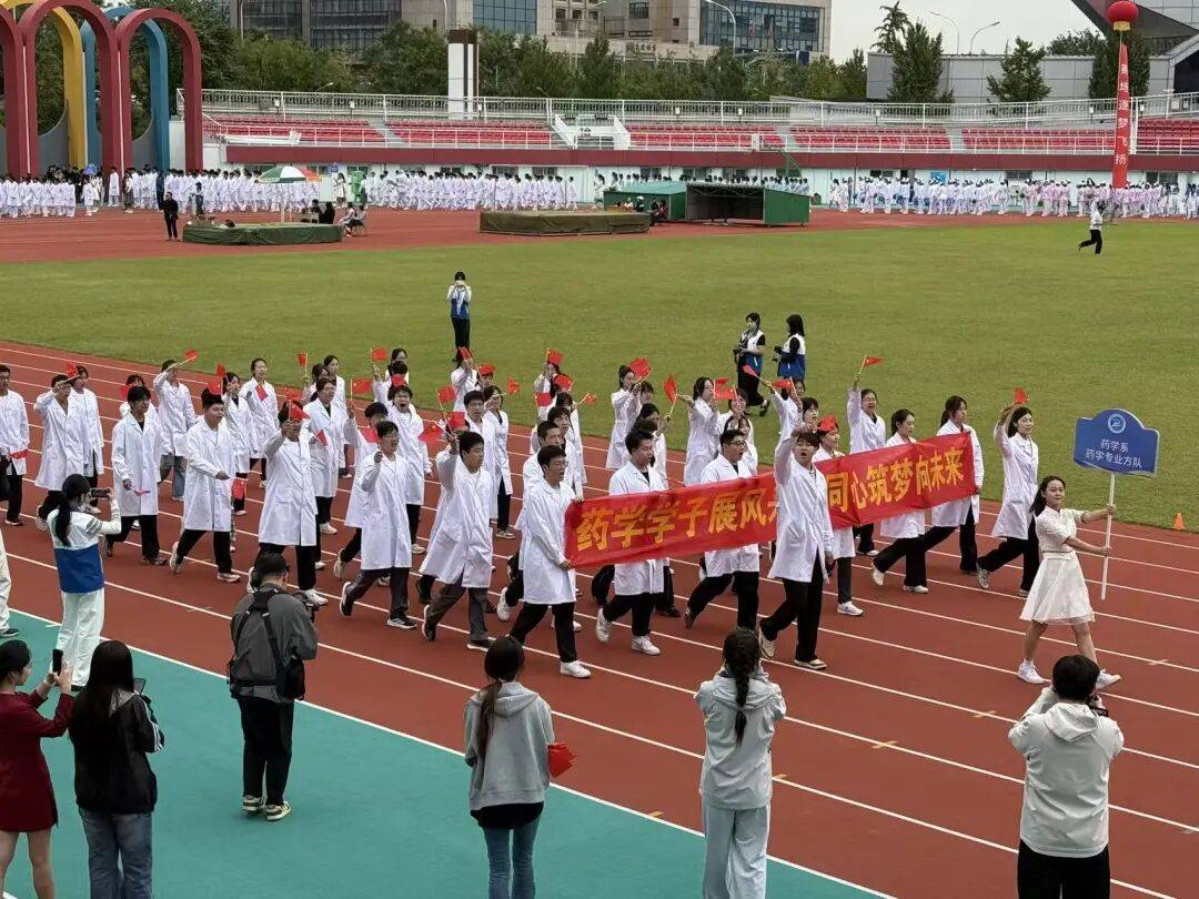 中药与康复系方阵尽显特色,成员们以“药海无涯”“传承精华”等标语牌与国旗造型牌组合亮相,传递出中药与康复系的独特专业追求。