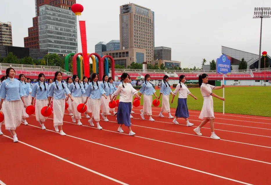 护理系方阵迈着稳健步伐登场,“上蓝下白”的民国服饰成为亮眼标志,既具复古韵味,也诠释了护理专业的温柔与严谨。