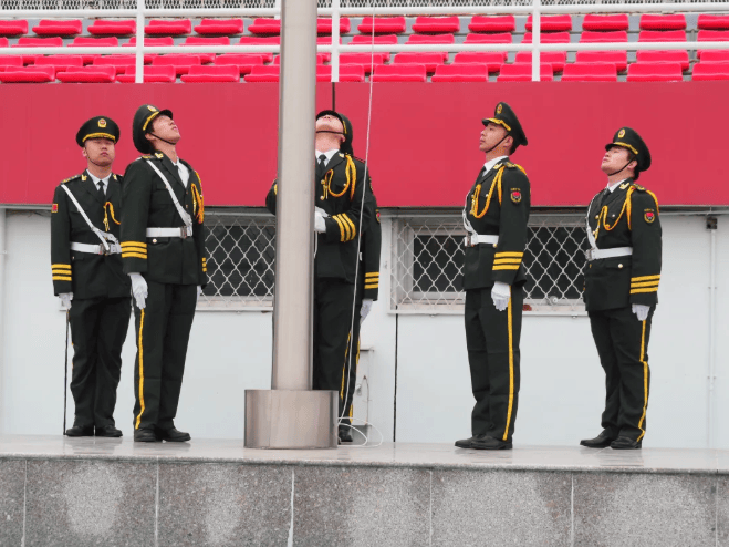 升旗仪式庄严举行!护旗手护卫着五星红旗走向升旗台。在雄壮的国歌声中,全场师生肃立行注目礼,注视着鲜艳的国旗冉冉升起,为运动会注入了庄严而磅礴的精神力量!